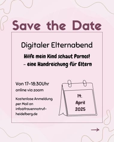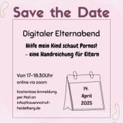 Der Frauennotruf Heidelberg bietet einen kostenlosen Elternabend zum Thema Pornografie an. Ziel des Elternabends ist es, über das Nutzungsverhalten pornografischer Medien bei Kindern und Jugendlichen aufzuklären und Handlungstipps für die Prävention und Intervention mitzugeben.
