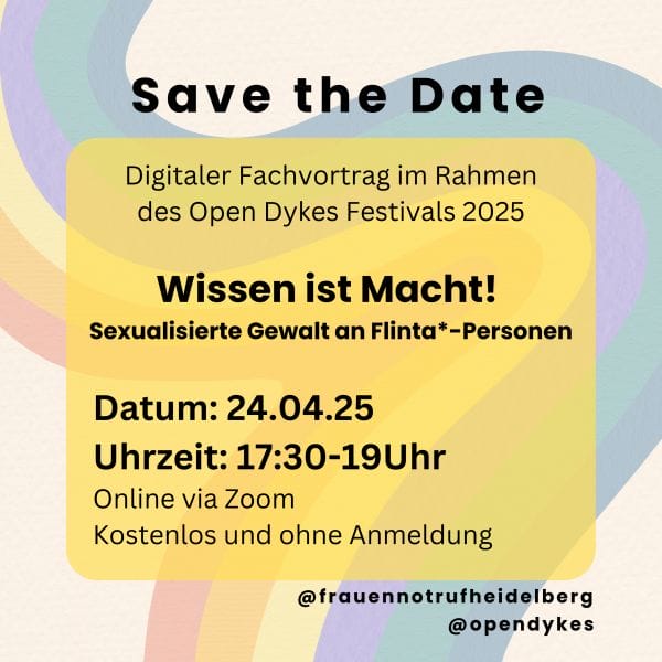 Der Frauennotruf bietet im Rahmen von OPEN DYKES 2025 einen kostenlosen und digitalen Vortrag zum Thema Sexualisierte Gewalt gegen Frauen, Lesben, intergeschlechtliche, nicht-binäre, trans und agender Personen (FLINTA*) an.