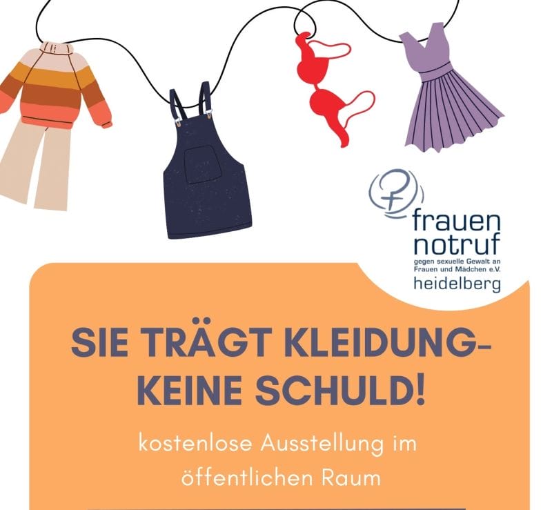 Vom 17. März bis einschließlich 19. April 2023 ist im Darmstädter Hof Centrum Heidelberg die Installation „Sie trägt Kleidung – keine Schuld!“ zu sehen. Der Frauennotruf weist mit der Aktion auf Mythen sexualisierter Gewalt hin. Die Ausstellung ist kostenlos zugänglich.