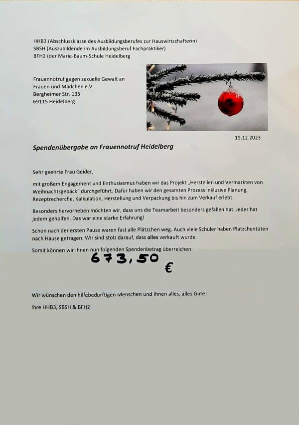 Die Durchführung dieses Projekts hat Tradition an der Marie-Baum-Schule. Eine tolle Aktion, wie wir finden. Vor Projektstart entscheiden die beteiligten Klassen, an welche Organisation der Erlös geht. In diesem Jahr haben sich die Teilnehmenden für den Frauennotruf Heidelberg entschieden. Darüber freuen wir uns sehr.